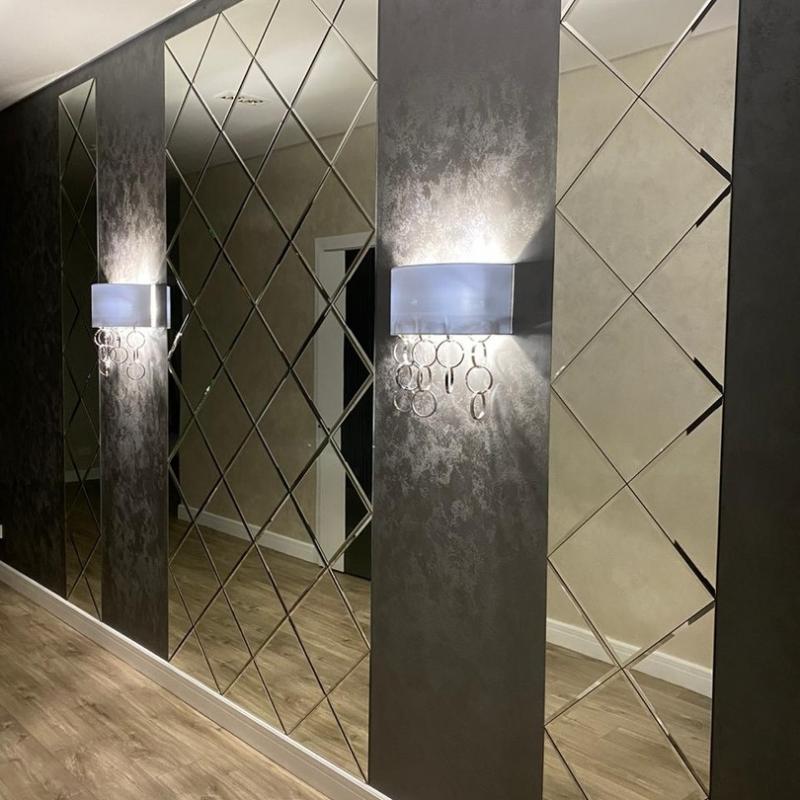 Использовалась серебристая зеркальная плитка формы "вытянутый ромб".